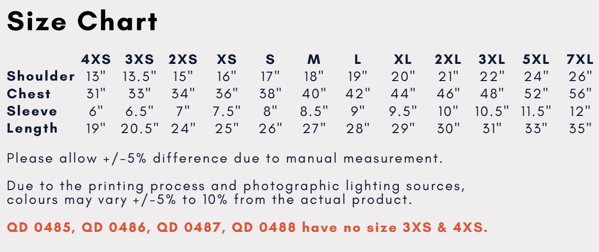- Unisex. Available size 4XS – 3XL, 5XL, 7XL